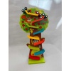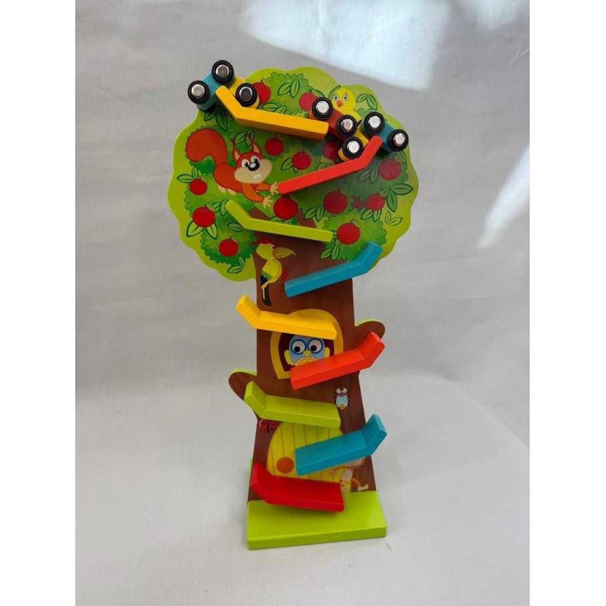 Wooden tree car track toy with accompanying race cars to ascend and descend the track.
