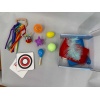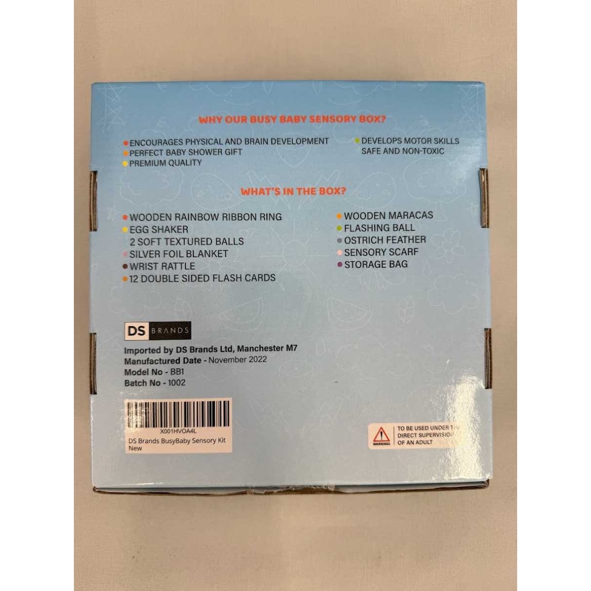 Includes; a wrist baby rattle , foil blanket ,soft balls, ribbon ring ,sensory scarf, feather, maracas, squeaky light-up ball, egg shaker and twelve black and white flash cards for the complete sensory experience.