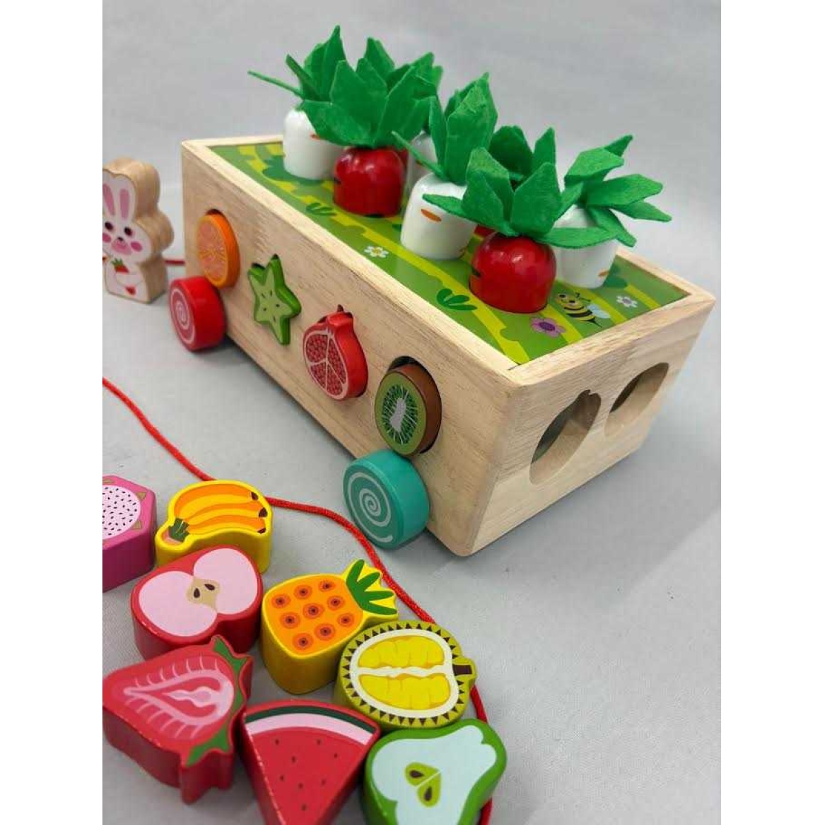 A wooden Montessori activity toy for ages 2–4 designed to build fine motor skills, shape recognition, colour matching and problem‑solving. The set includes carrots to “harvest,” fruits for sorting, worms to catch with a magnetic rabbit and multiple hands‑on activities built into a car‑shaped wooden base. Made from natural solid wood with smooth edges and non‑toxic paint, it offers safe and durable play that encourages creativity and early learning.