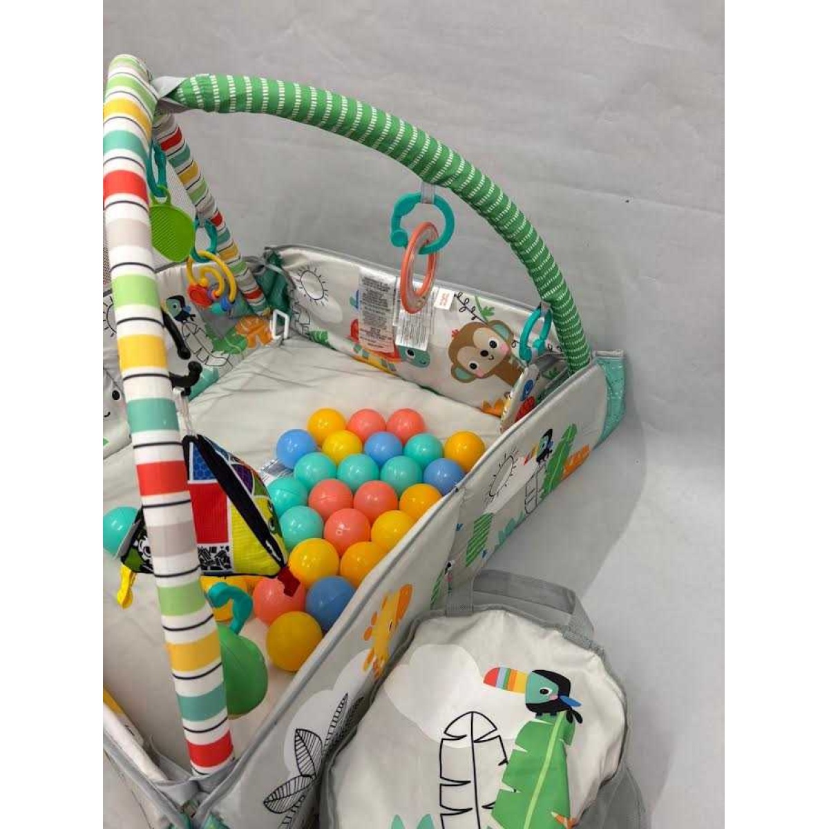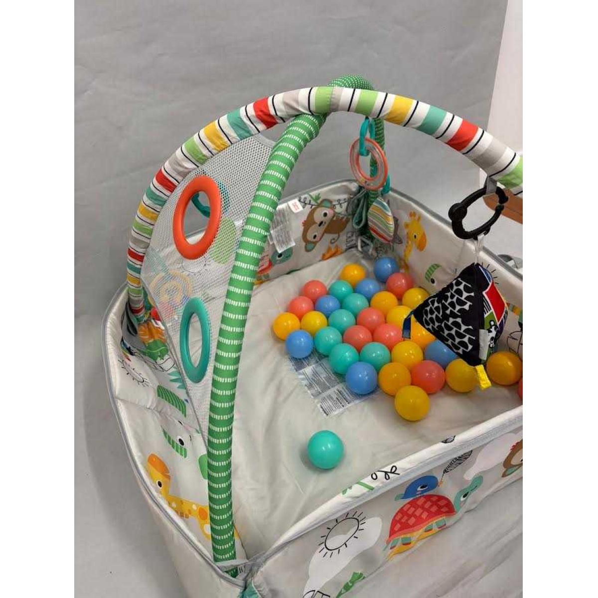 Bring the JOY of a ball pit right to your living room with the 5-in-1 Your Way Ball Play Activity Gym & Ball Pit from Bright Starts! With 5 ways to play, this activity mat is super flexible for whatever your baby’s age or stage needs. You can even adjust the plush walls down or up to fill the play gym with 40 colorful balls, making the joy last through the toddler years! Mom and dad can get in on the action (and get lots of co-play bonding time) by dropping the balls through the mesh canopy hole. As baby grows up, he can practice motor skills by dropping the balls himself! For younger babies, the jumbo playmat lays flat for tummy time (psst, we even added in a tummy time prop pillow). The cheerful elephant toy plays music and lights up to catch and keep baby’s attention. You’ll love the Totally Tropical fashion complete with toucans, palm trees and more. Playtime is all around with 6 additional toys: bead chaser, safari-themed crinkle toy, baby-safe mirror, flash cards, hanging leaf toy and bead rattle. Who’s ready to have a ball with Bright Starts?