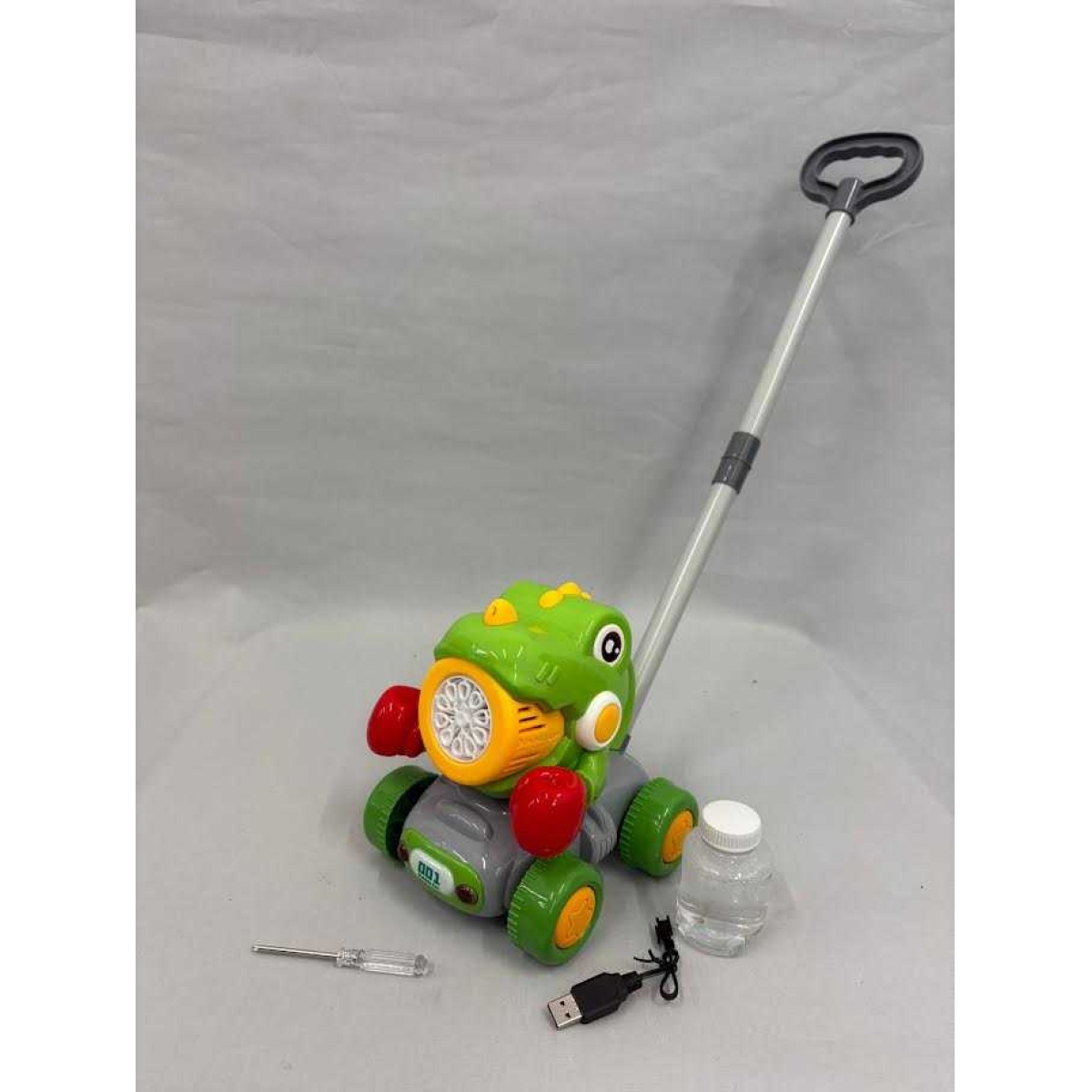 A fun dinosaur‑boxing themed bubble lawn mower toy for children aged 3 and up. It produces lots of bubbles, lights up with vibrant colours and features moving “boxing glove” arms when pushed. The detachable handle allows different play styles, and the built‑in lithium battery and leak‑proof design make it easy for kids to use outdoors in the garden or at parties.
