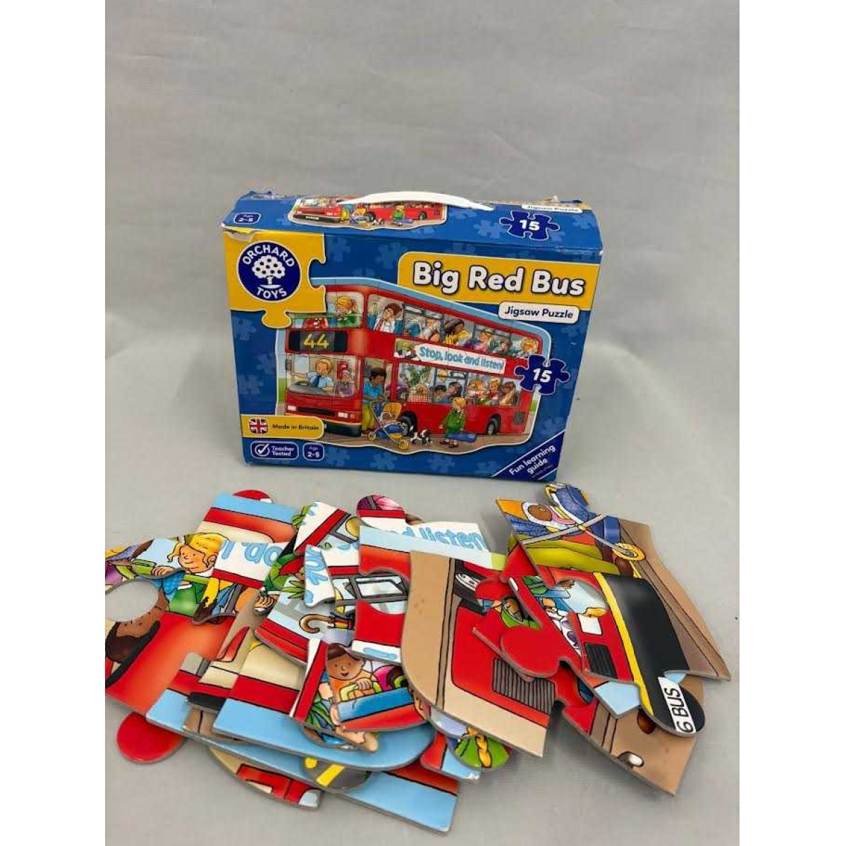 A bright, colourful 15‑piece shaped floor puzzle featuring a busy red bus full of fun characters. Designed for ages 2–5, the chunky pieces are easy for small hands to hold and help children build observation skills, conversation skills and hand‑eye coordination. Finished puzzle size is approximately 59 × 42 cm.