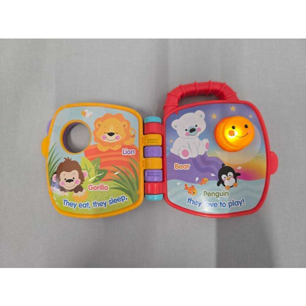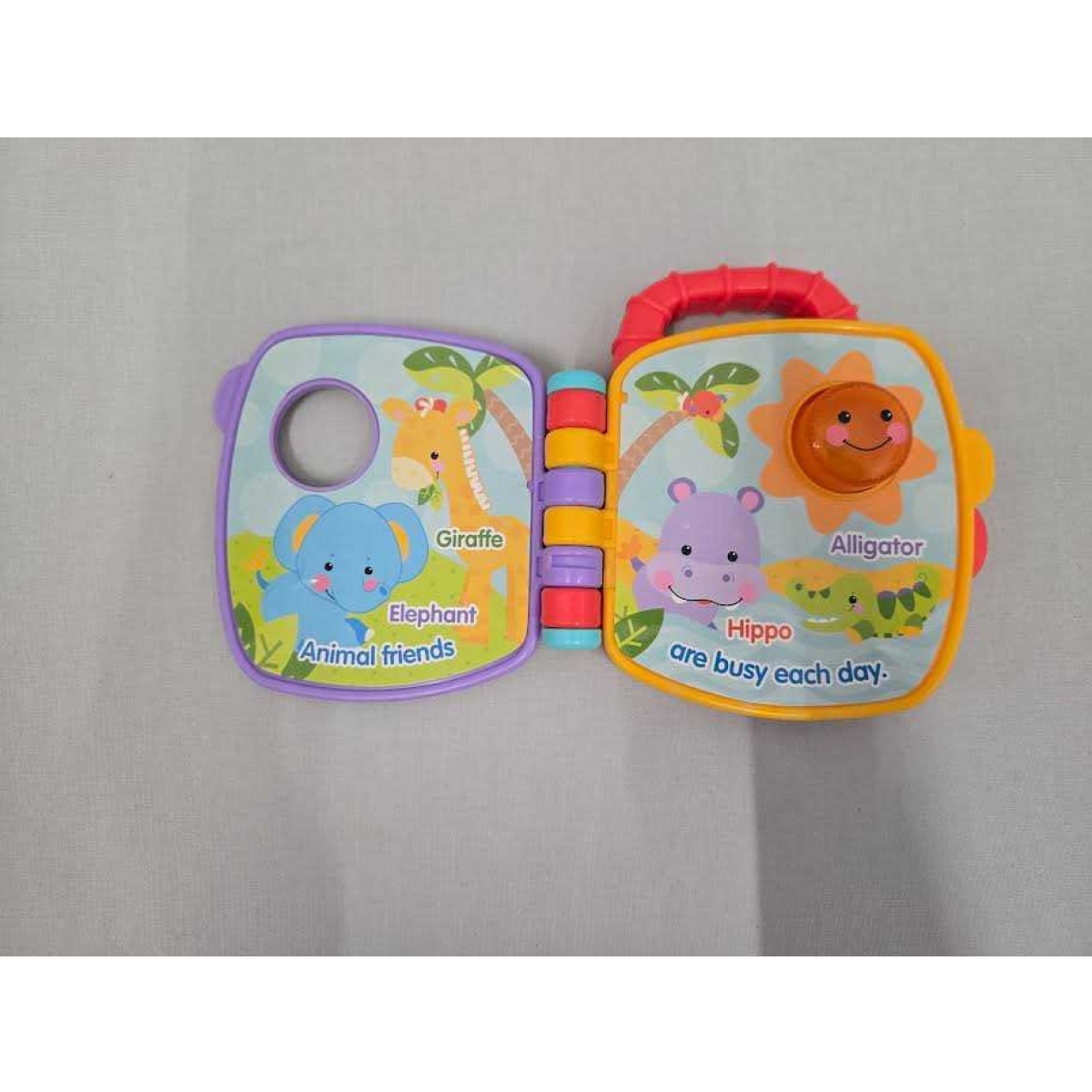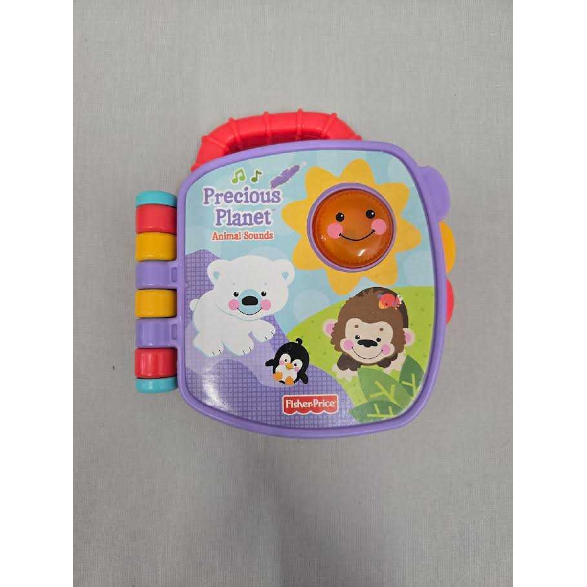 The Fisher-Price Precious Planet Animal Sounds Book s an interactive, portable storybook designed to teach animal sounds through light-up fun, music, and durable, easy-to-turn pages. It features,, soft animal characters and includes a built-in handle for travel.