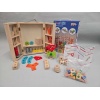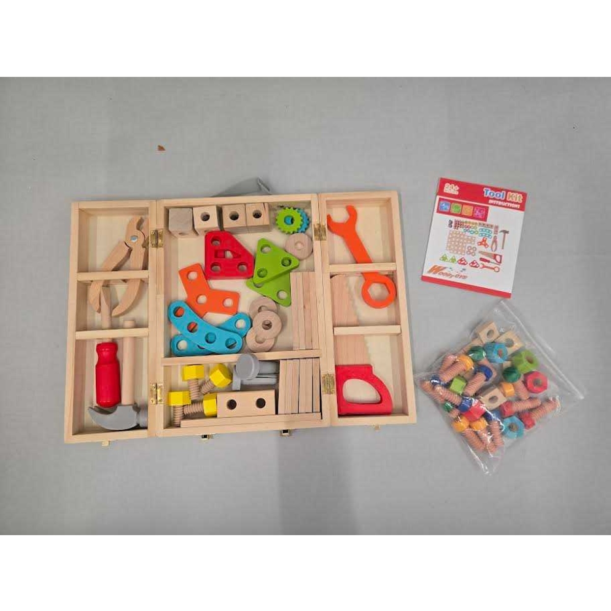 Kids wooden DIY toolkit including toy hammer, screwdriver pliers, saw, spanner and multiple fixings, nuts and bolts.