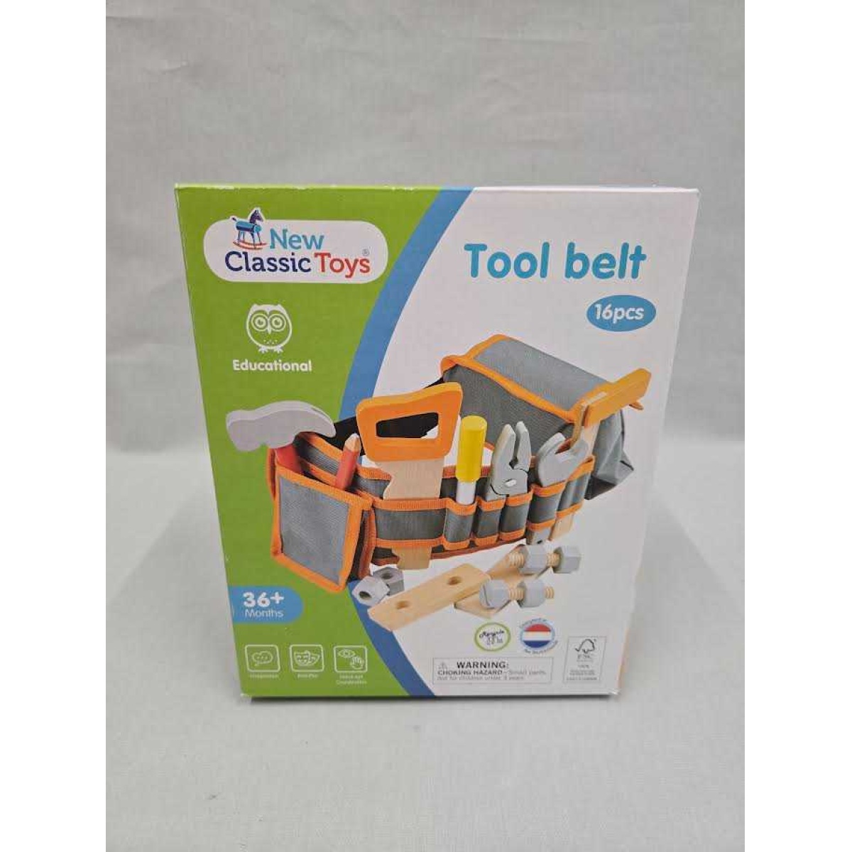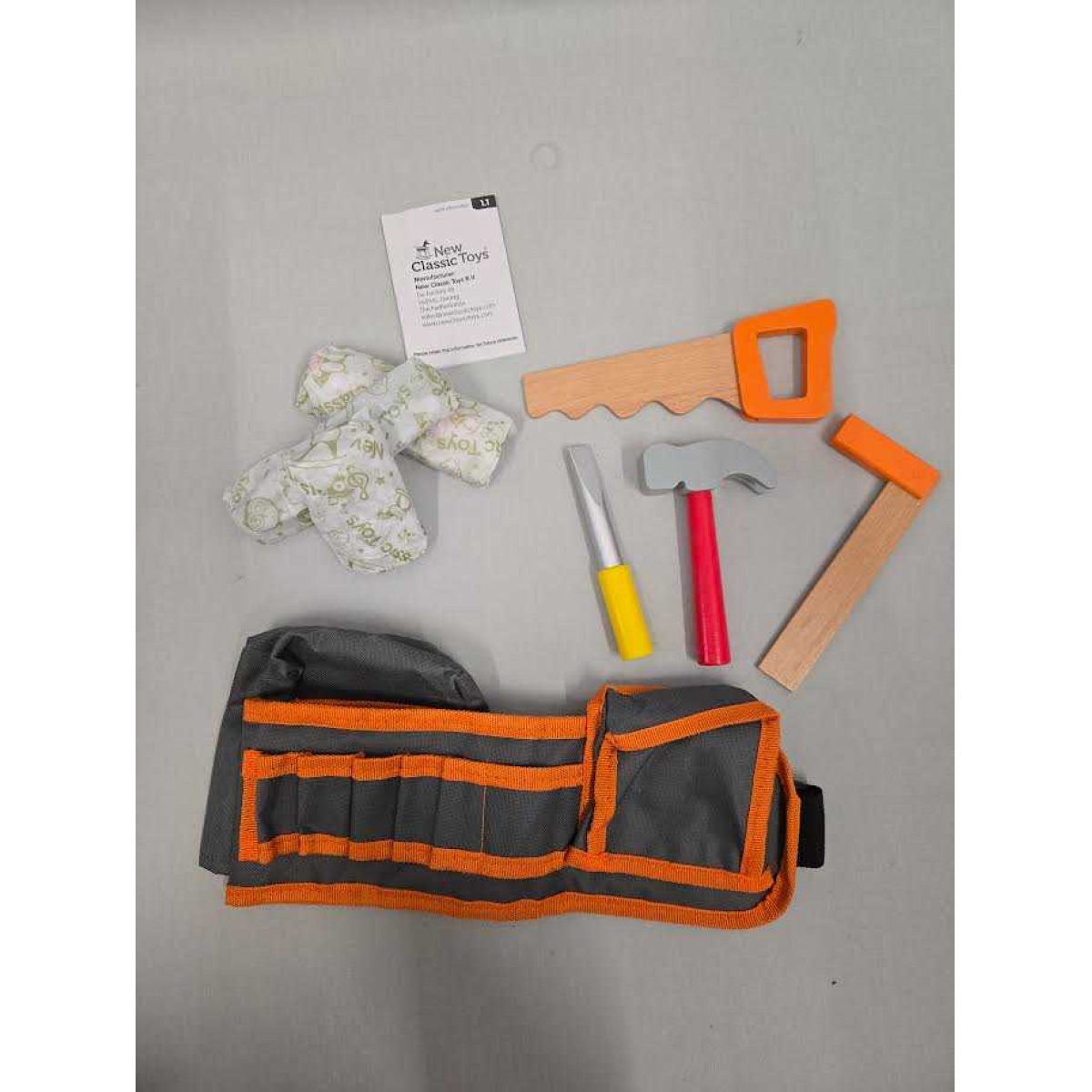 New Classic Toys - Tool Belt Set - Orange - Wooden Pretend Play Construction Set - Includes Hammer, Saw, Screwdriver, Pliers, Wrench, Ruler, Bolts, Nuts, and Wood Blocks - Adjustable Fabric Belt.