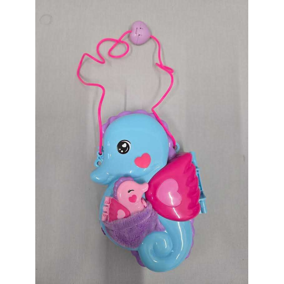 A convenient purse strap makes it super simple to pack up the fun and take daddy seahorse and baby anywhere.