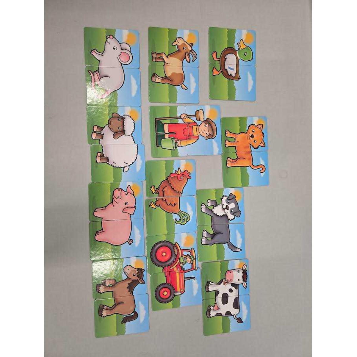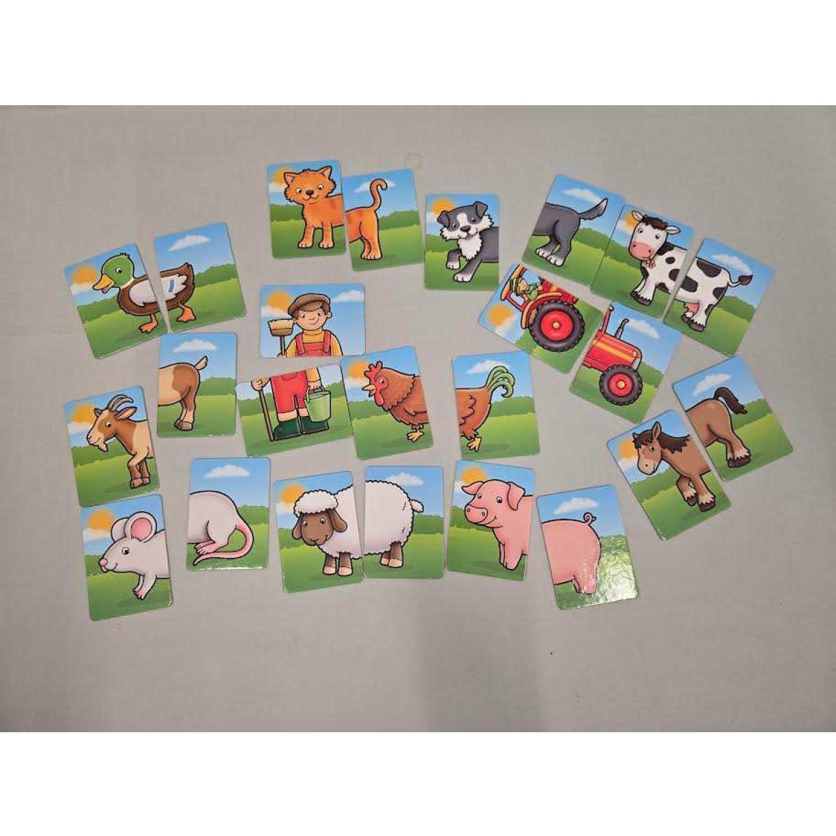 FRIENDLY FARM ANIMALS: 12 familiar characters and objects are split over 24 cards in this toddler matching game. The illustrated cards depict a cow, chicken, goat, duck, tractor, pig and farmer.